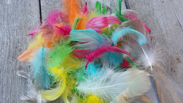 Пір'я декоративні фарбовані натуральні. В упаковці різні розміри пір'я. В упаковці різні кольори. 150 шт. Розмір пера від 2 до 12 см.
