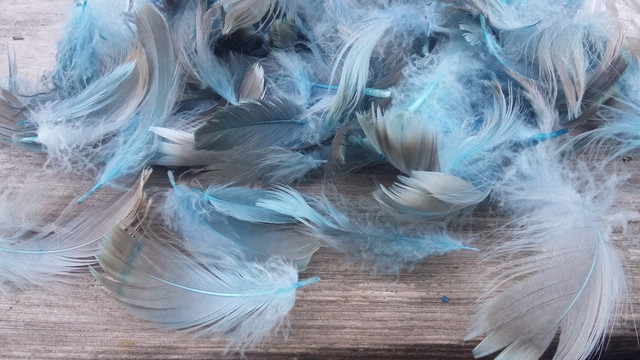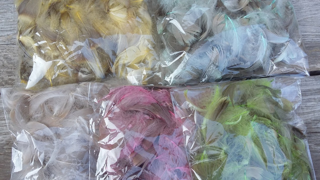 Пір'я двоколірне рожеве з темними кінчиками. Відтінок затемнення може бути різний, від сірого до чорного. В упаковці приблизно 150 шт пера розміром від 2 до 12 см. Це приблизно 5 грам. Розмір пакування 16*12 см.