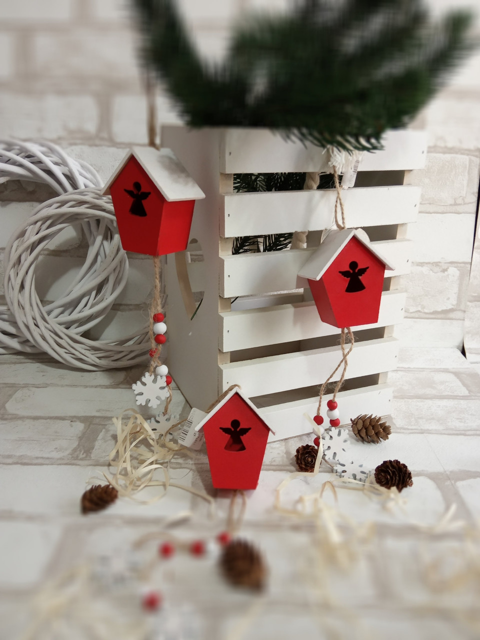 Оригінальна підвіска на ялинку або як окремий елемент декору. Матеріал підвіски — дерево. Розміри будиночка 6х4 см, висота будиночка — 7 см., довжина підвіски приблизно 35 см. Підвіски можуть бути різних кольорів. Вічний виріб, досить стійкий до ударам. Така ялинкова іграшка не тільки стильна та модна, але й дуже практична для дому, в якому є дітки.